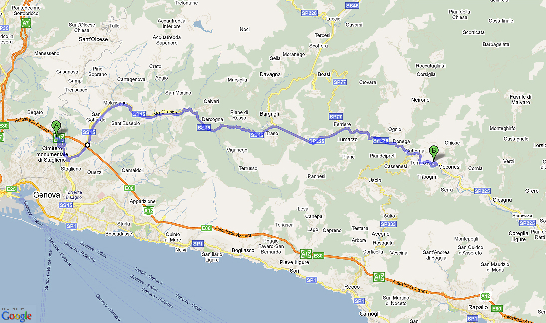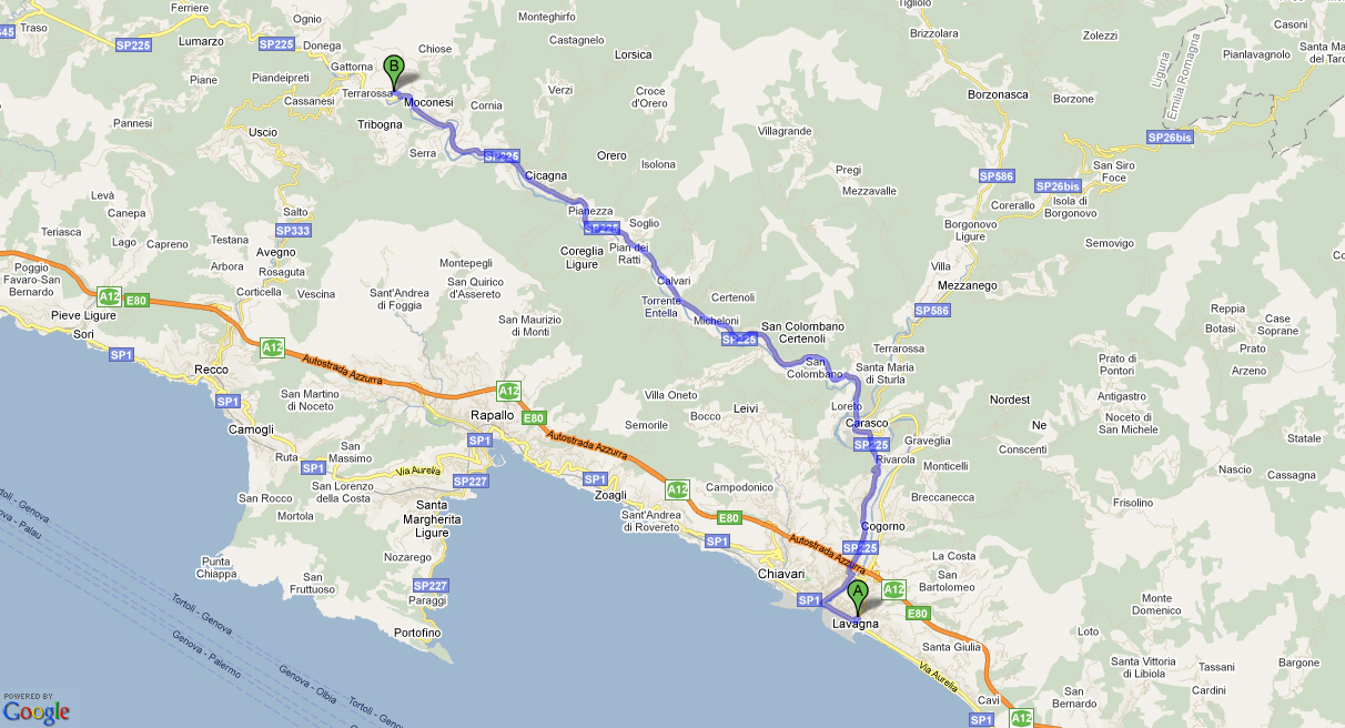 - ca. 36 Km (via Chiavari) o ca. 20 km (attraversando il passo “Crocetta”) da Rapallo